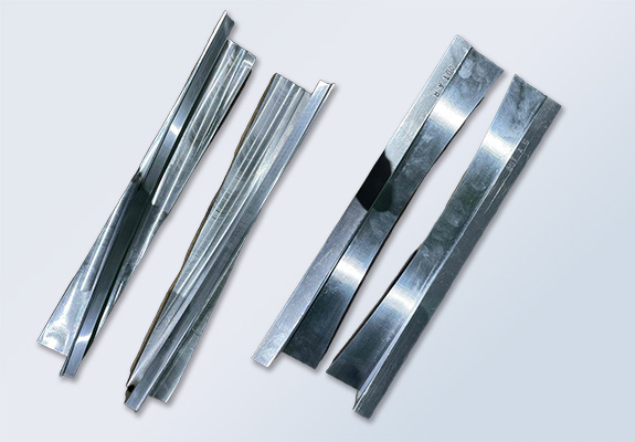 主に民間航空機のフレーム材の板金加工を行っています。熱処理により曲げやすくなったアルミ型材を弊社所有のストレッチフォーマーにセットしR形状の金型に沿った形状に曲げ加工を行い、その後、曲げ成形で生じた歪を手作業で修正し、機械加工後は表面の微細な疵をブレンド仕上げします。板金部品の月間扱いはおよそ1万個以上を数えます。